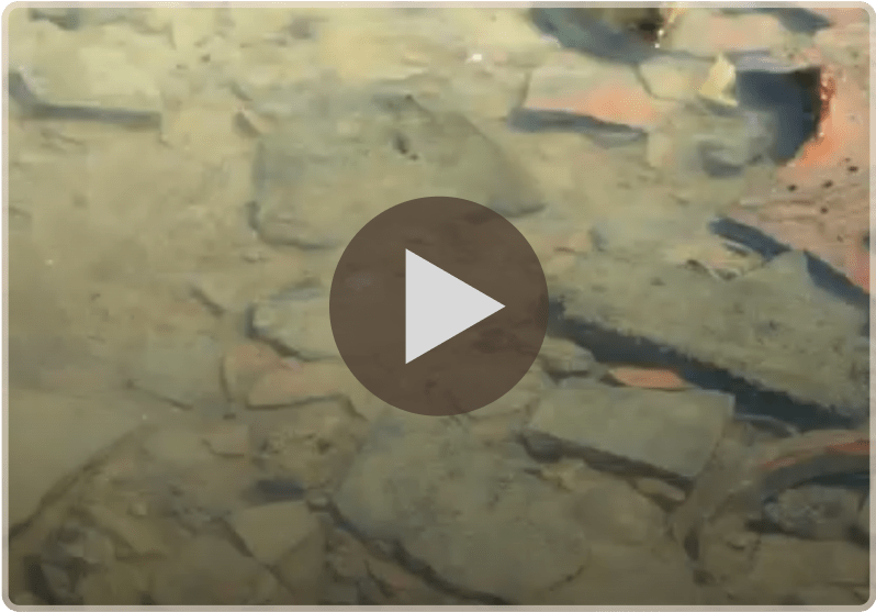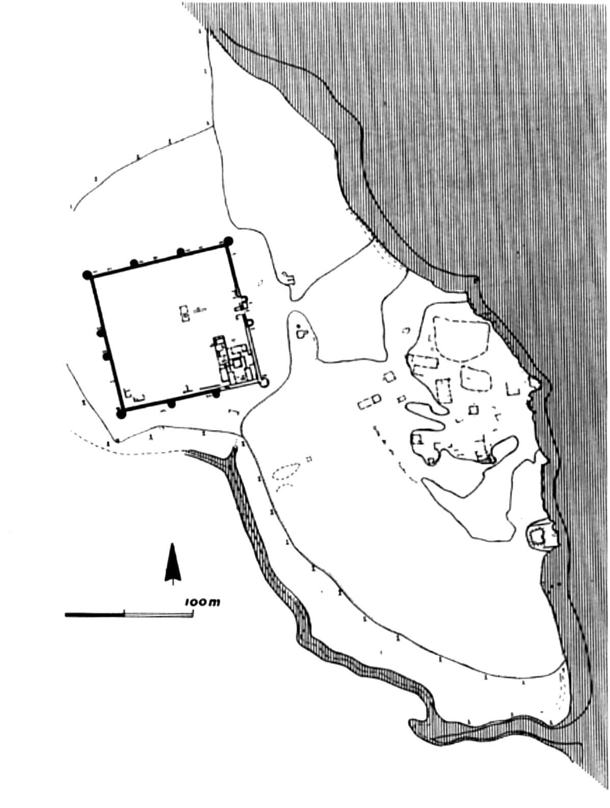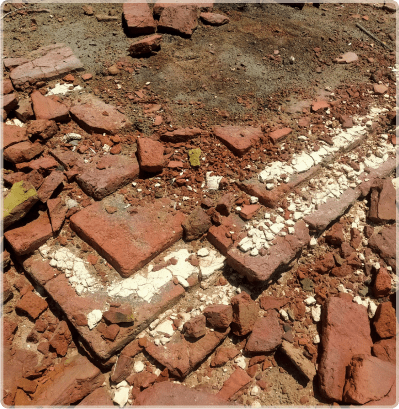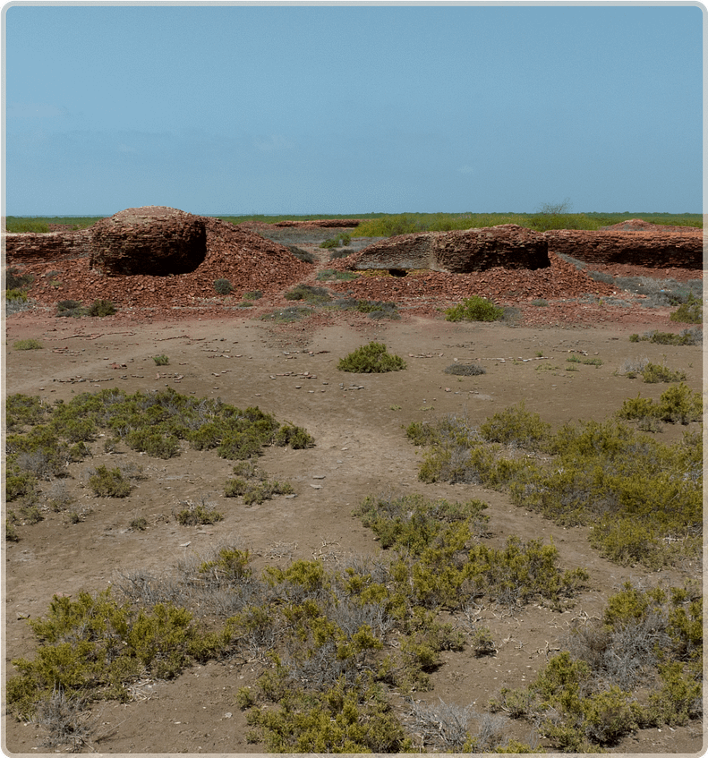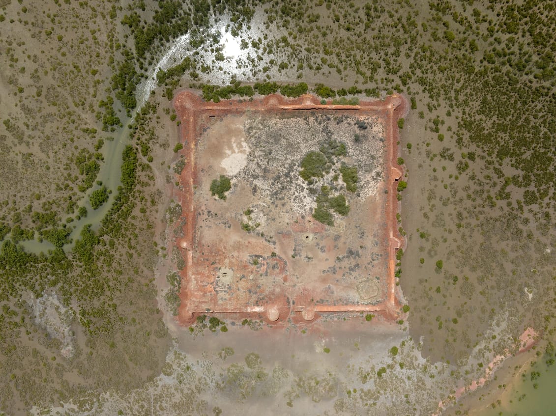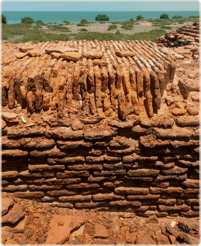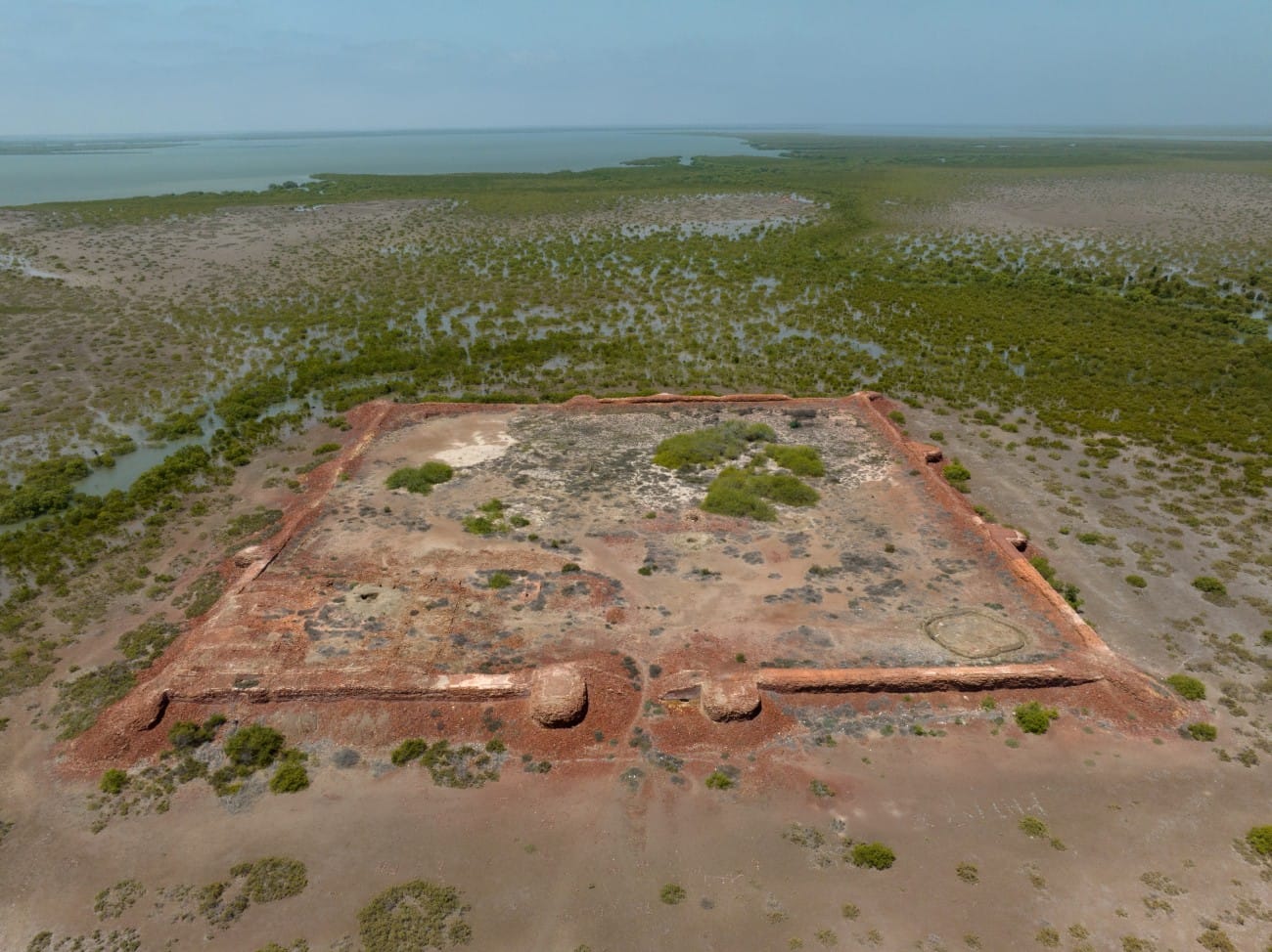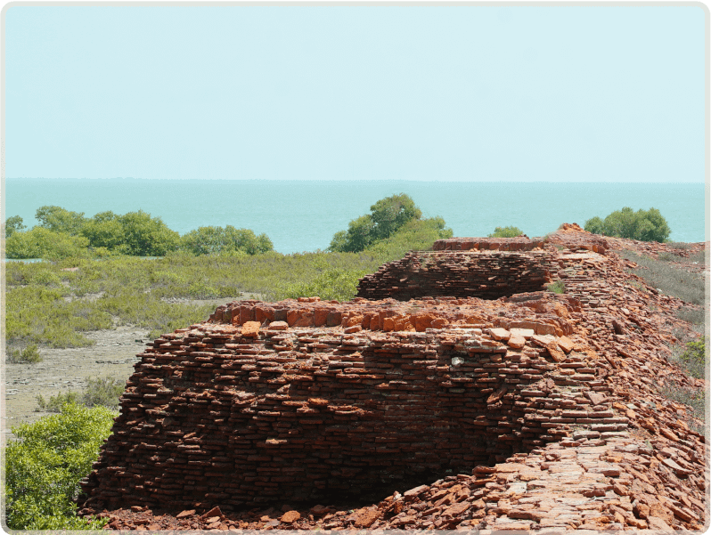 Today we find remains of the Lahiri Bandar, about 4 square kilometres in size, on a crescent-shaped island in the delta. The main site consists of ruins of a square-shaped fortress, approximately 100m to a side, with 1.7 metre thick walls, standing about 3m high. The fort has an eastward facing gate and a total of 12 towers on the walls, with four at the corners, and two on either side of the gate entrance. The structures, made from red fired brick, now lie mostly in ruin. Also visible are tiled floors and foundations of structures inside the fort, suggesting a residential or administrative purpose. There is a cluster of trees in the middle of the fort which may have been where a water reservoir once existed. Outside the fort exists a more extensive footprint of a city wall, possibly to defend against the rising creek waters, and an industrial area recognized by the presence of kilns, slag, and pottery wasters.