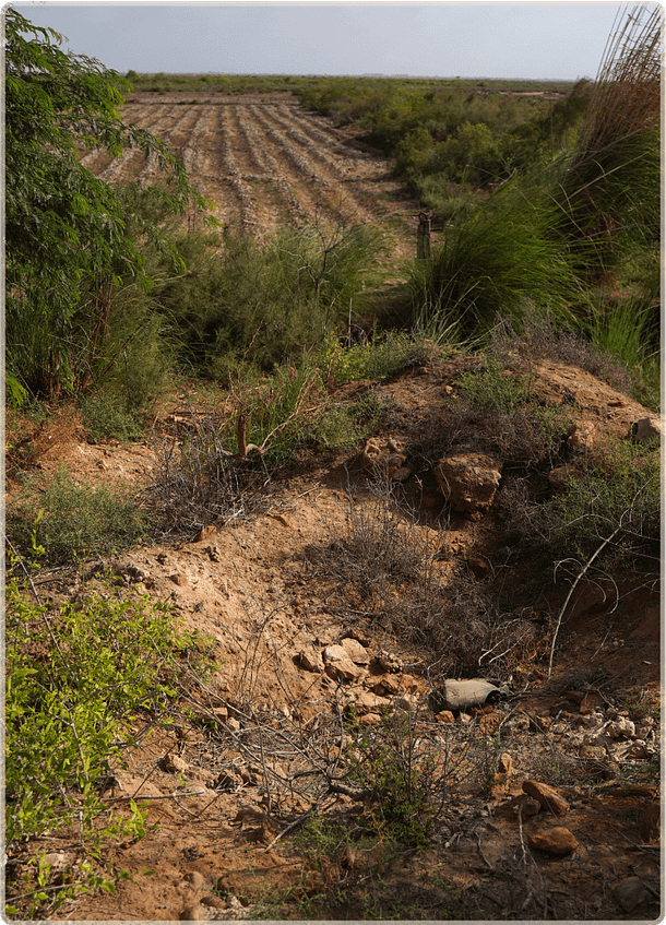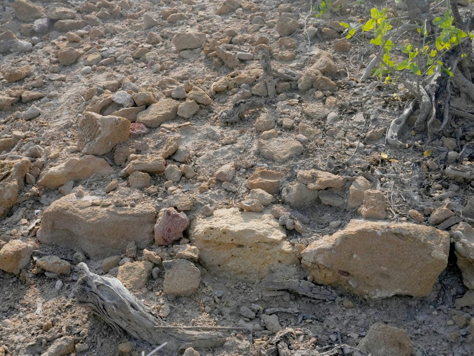 مقصدن لاءِ زمين جي ٻيھر بحاليءَ سبب ٿي. ھڪ تنگ چينل ان ھنڌ تان وھي ٿو جتي اتر واري ديوار هجڻ گھرجي ها، پر اهو واضح ناهي ته چينل جي کوٽائي ديوار ۽ ان جي مينار جي تباهي سان لاڳاپيل آهي. اهڙي طرح اوڀر واري ديوار به غائب آهي. هن ڀت جي قطار سان گڏ هڪ وڏو سرن جو دڙو موجود آهي جيڪو قلعي جي دروازي جي باقيات سان لاڳاپيل ٿي سگهي ٿو.
